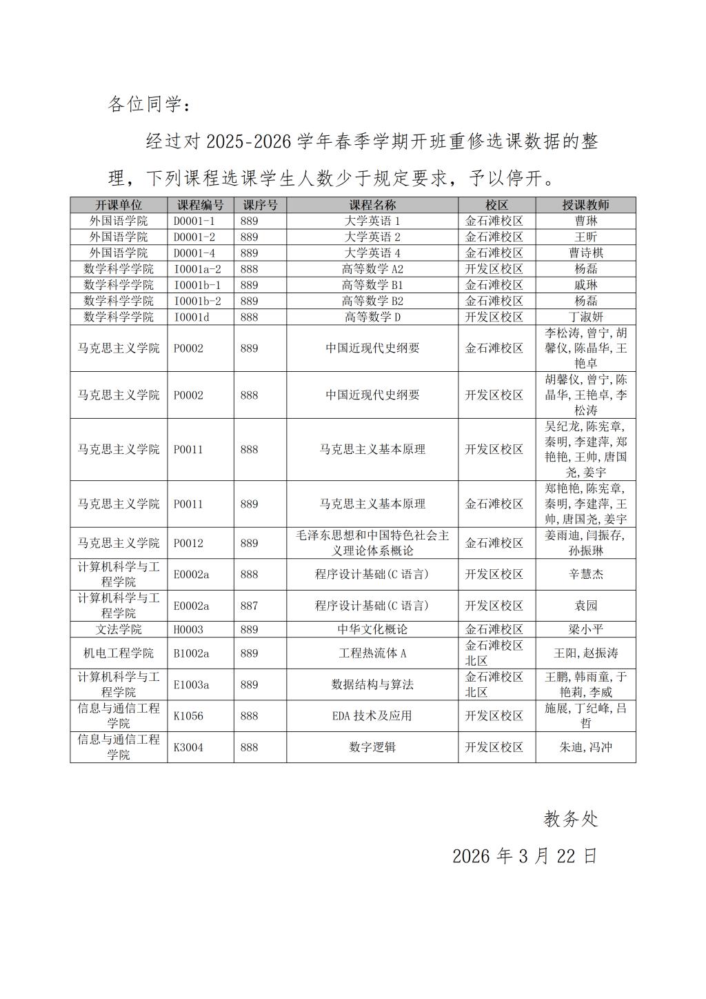 关于2025-2026学年春季学期开班重修部分课程停开的通知